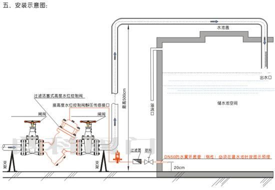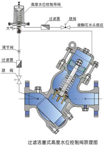 二、過濾活塞式高度水位控制閥特點: 1、純機械水力操作,取消了浮球(電浮球)和電器控制,克服以往水位控制閥頻繁啟閉的缺點,利用水池水位變化,靜壓水頭之差、控制主閥啟閉、控制安全、可靠、準確。 如使用在海水中訂貸時需注明。三、過濾活塞式高度水位控制閥主要技術參數(shù)和主要零件材料: