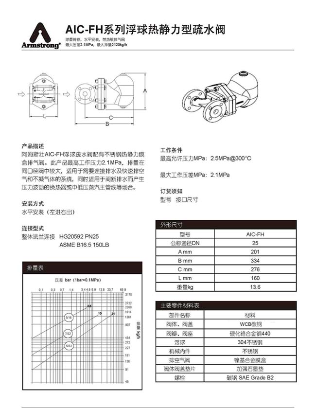 阿姆斯壯AIC-FH浮球疏水閥配有不銹鋼熱靜力膜盒排氣閥。此產(chǎn)品高工作壓力2.1MPa,優(yōu)良的排水量,適用于需要連接排水及快速排空氣和不凝氣體的系統(tǒng),同時適用于間斷排水而產(chǎn)生壓力波動的換熱器或中低壓蒸汽主管線等場合。
