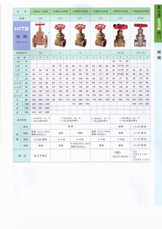 日本北澤KITZ銅閘閥:是指關(guān)閉件(閘板)沿通道軸線的垂直方向移動(dòng)的閥門,在管路上主要作為切斷介質(zhì)用,即全開或全關(guān)使用。內(nèi)螺紋連接的閘閥與管端相連接,需控制管端外螺紋長度尺寸。以免管端過量旋入以致頂壓閘閥管螺紋內(nèi)端面,造成閥座變形而影響密封性。法蘭連接閥門的法蘭與管端的法蘭不僅與規(guī)格尺寸一致,而且需公稱壓力一致。