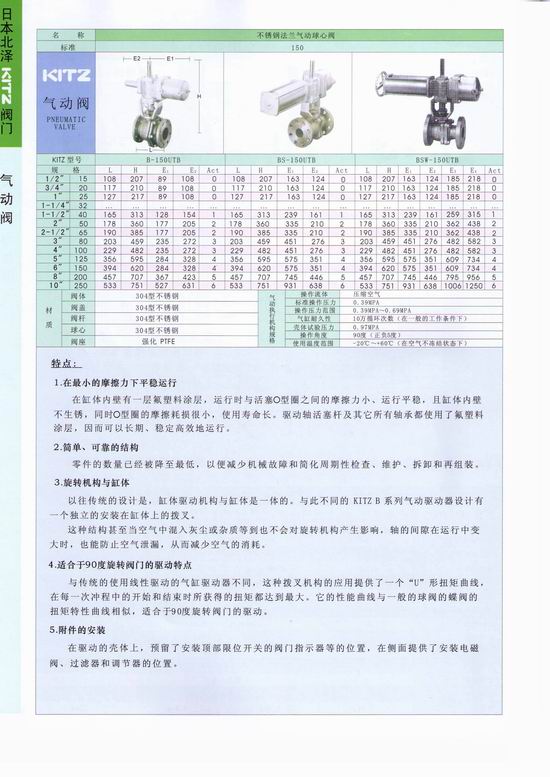 日本北澤KITZ氣動球閥:氣動內(nèi)螺紋球閥是由雙(單)作用氣動活塞式執(zhí)行器和內(nèi)螺紋球閥組成。其閥體可分為整體式、二段式、三段式。閥座采用彈性密封結(jié)構(gòu),密封可靠,啟閉輕松。閥桿采用有倒密封的下裝式結(jié)構(gòu),閥腔異常升壓時(shí),閥桿不會被沖擊。氣動活塞式執(zhí)行器采用低摩擦材料做成軸承套,缸體內(nèi)外表面經(jīng)硬質(zhì)陽極氧化防腐處理,提高了氣缸的使用壽命。本產(chǎn)品使用性能穩(wěn)定,廣泛的用于石化、冶金、電力、輕工、醫(yī)藥等工業(yè)部門
