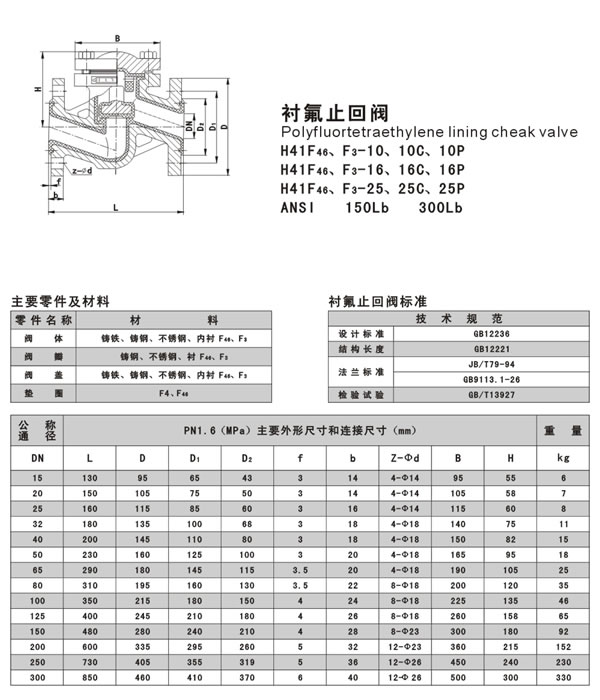升降式襯氟止回閥是一種依靠介質(zhì)本身的流動而自動啟閉閥瓣用來阻止介質(zhì)逆向流動的自動閥門,襯里止回閥基本類型有四種:H41型法蘭連接直通升降式止回閥和H42型升降立式止回閥、H44立式止回閥、H76旋啟式止回閥。襯氟止回閥內(nèi)襯聚四氟乙烯,將介質(zhì)與閥體完全隔離開,避免腐蝕性的介質(zhì)對閥體侵蝕。適用場合各種濃度的王水、硫酸、鹽酸、氫氟酸和各種有機酸、強酸、強氧化劑等。