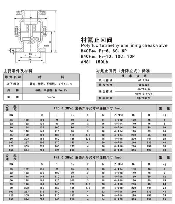 H40F46型襯氟止回閥是一種依靠介質(zhì)本身的流動而自動啟、閉閥瓣用來阻止介質(zhì)向逆向流動的自動閥門。襯里新型止回閥。FEP(F46)、PCTFE(F3)襯氟止回閥適用在-20℃~150℃的各種濃度的王水、硫酸、鹽酸、氫氟酸和各種有機(jī)酸、強(qiáng)酸、強(qiáng)氧化劑,F(xiàn)EP還適用于各種濃度的強(qiáng)堿有機(jī)溶劑以及其它腐蝕性氣體、液體介質(zhì)的管路上使用。 閥。 |