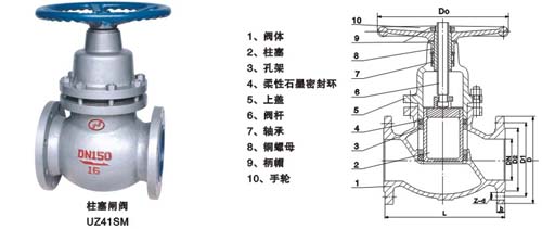 柱塞閘閥(UZ41SM)是由閥體、閥蓋、閥桿、柱塞、導(dǎo)向套、密封環(huán)、手輪等零件組成 (如圖)。當(dāng)手輪旋轉(zhuǎn)時(shí),通過閥桿帶動(dòng)柱塞在導(dǎo)向套中上、下往復(fù)運(yùn)動(dòng),使柱塞端部斜錐面與閥座面完成閥門的開啟與關(guān)閉功能。
